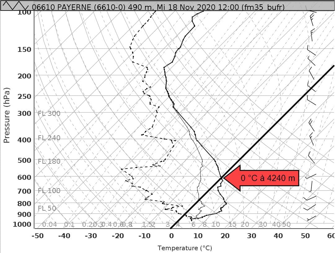 Radiosondage effectué près de Payerne en Suisse matérialisant un isotherme 0°C à plus de 4000m d'altitude - Via Météo-Suisse
