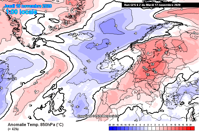 Anomalies de températures à 850 hPa sur l'Europe en journée du 18 Novembre - Modèle GFS via météociel.fr