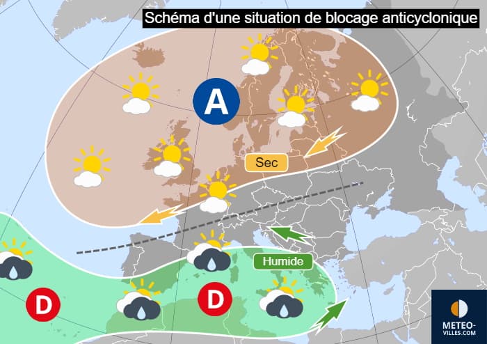 Si les blocages anticycloniques ont toujours existé, leur fréquence a été supérieure à la normale ces dernières années. Ces derniers ont tendance à se positionner entre le nord de l'Atlantique et la Scandinavie en protégeant tout le nord de l'Europe, forçant les dépressions à glisser des Açores vers le bassin méditerranéen. En France, cela se traduit par des situations sèches & ensoleillées au nord mais parfois plus mitigées au sud, concerné par les remontées humides de Méditerranée.