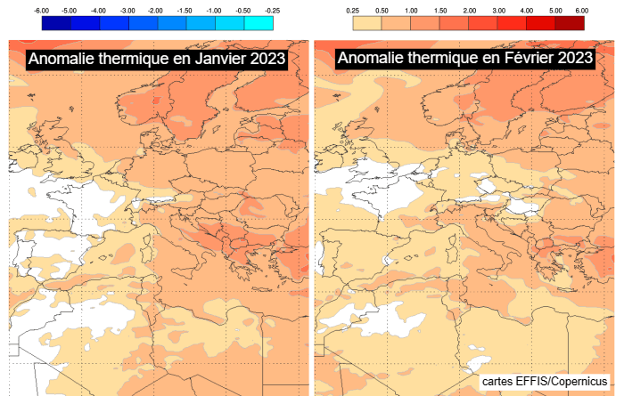 Anomalie thermique selon le modèle européen pour janvier et février 2023 - via EFFIS/Copernicus