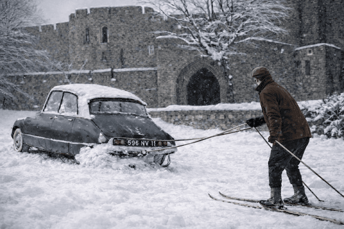 Mieux vaut tirer partie de la situation… À Carcassonne, sous plusieurs dizaines de centimètres de neige au mois de février 1963 - photo colorisée - archives meteo-paris.com