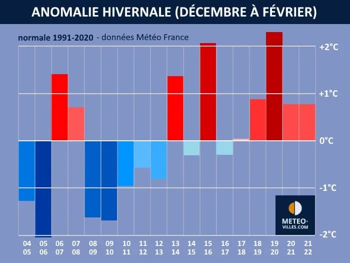Anomalies thermiques en hiver (période décembre – février) en France entre 2004 et 2022 – Météo-Villes