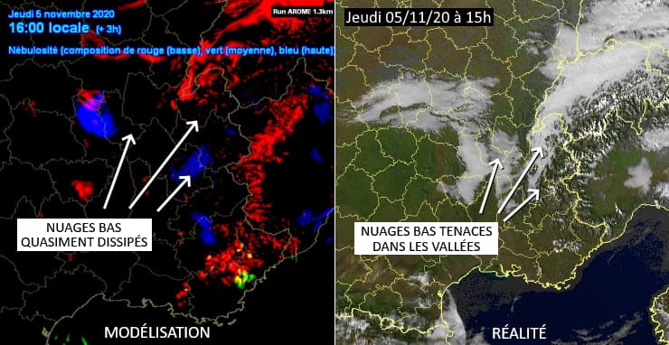 Comparaison entre la prévision du modèle AROME et l'observation satellite le 5 novembre 2020 - via meteociel.fr