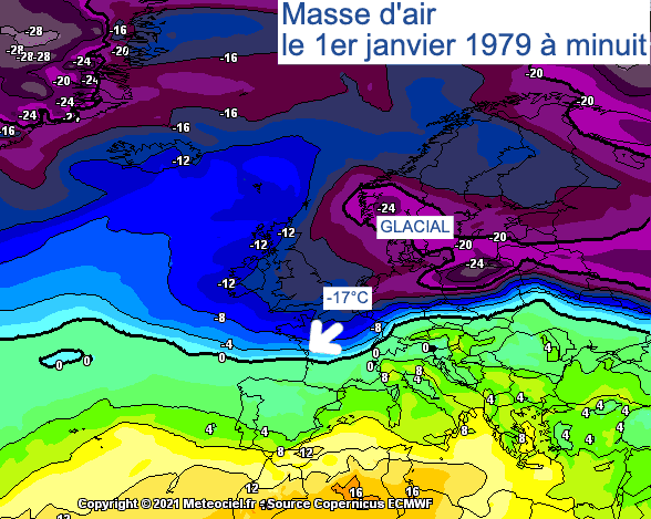 L'impressionnante masse d'air polaire glaciale qui recouvre toute la partie nord de l'Europe et aborde tout le nord de la France dans la nuit de la Saint Sylvestre 1978-1979 !