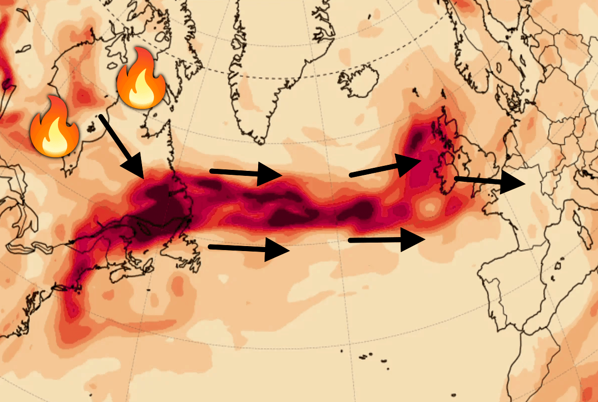 C'est un fait désormais récurrent et qui avait déjà été remarqué au mois de juin : les fumées issues des incendies du Canada survolent de nouveau la France cette semaine. Et pour cause : les conditions météorologiques à large échelle sont très favorables depuis plusieurs jours. Le courant jet est anormalement dynamique au dessus de l'océan (en témoigne la tempête ayant frappé le nord des Îles Britanniques il y a quelques jours) avec des vitesses atteignant 250 km/h ! Ce couloir de vent d'altitude (vers 9000m) qui relie Amérique et Europe transporte avec lui les fumées issues des incendies canadiens.