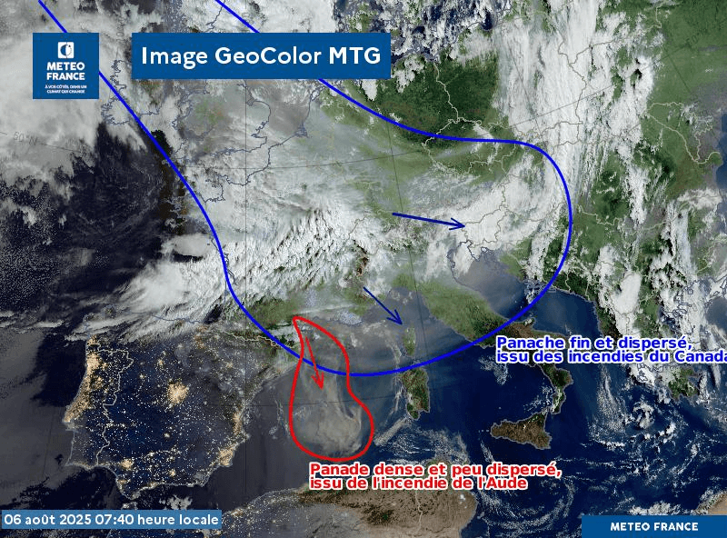 Le dramatique incendie en cours dans le département de l'Aude (plus de 17.000 hectares parcourus) génère un panache de fumées remarquable mais ce dernier a été dirigé au dessus des eaux de la Méditerranée, comme le montre l'image satellite au matin du mercredi 6 août 2025. Nous avons bien des fumées dans notre ciel mais celles-ci proviennent du nord de l'Amérique, avec des concentrations qui étaient parfois modérées ces dernières heures, bien visible depuis le satellite.