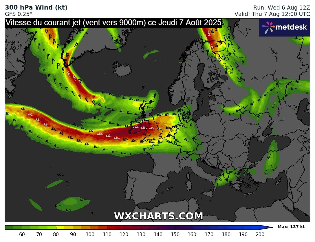 Vitesse du courant jet sur l'Atlantique ce jeudi 7 août 2025 - wxcharts.com