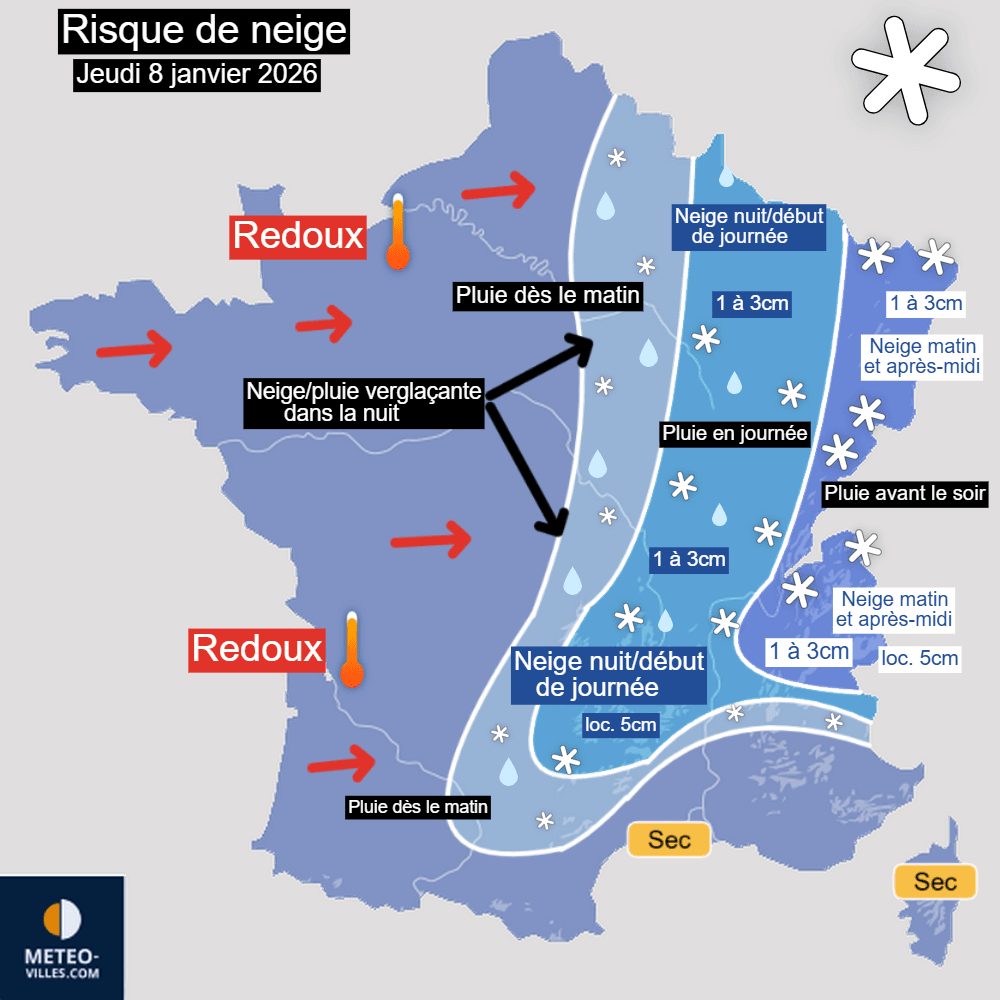 Cumuls de neige envisagés pour la journée du jeudi 8 janvier 2026 – Météo-Villes