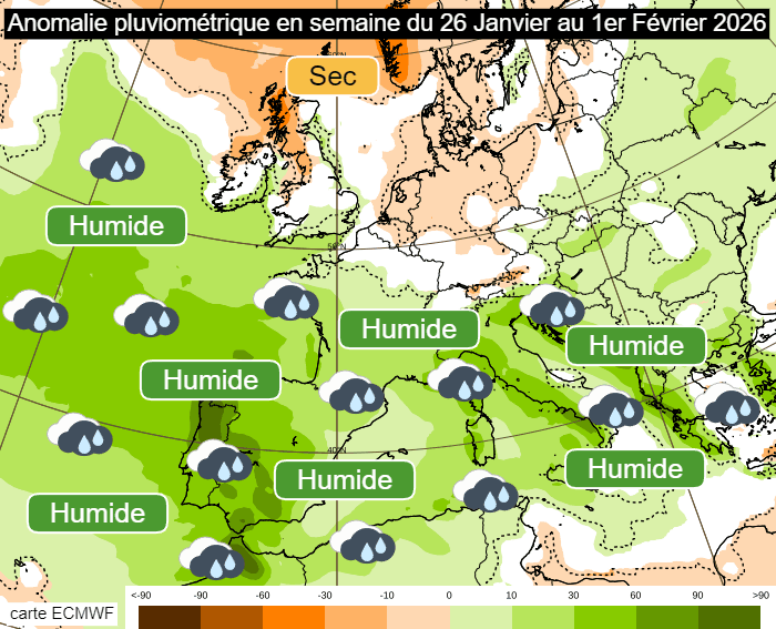 Si le froid et la neige ne s'installeront finalement pas, il faudra tout de même être très attentif aux conditions météorologiques de cette fin janvier 2026. En effet, avec la domination du flux océanique dépressionnaire, une succession de perturbations est attendue sur la France. Les tendances pour cette semaine du 26 janvier au 1er février montrent une anomalie humide nette sur l'ouest et le sud de la France. Celle-ci épargnerait les régions frontalières du nord où les précipitations s'annoncent moins copieuses. Notons que l'Espagne et surtout le Portugal s'attendent à des quantités de pluie remarquables !
