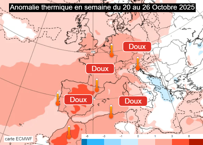 Malgré tout, les perspectives ne sont pas favorable à l'arrivée des gelées pour les principales villes du pays. La reprise du courant océanique dépressionnaire pour la dernière décade du mois augure une domination de la douceur. L'anomalie thermique sur 7 jours envisagée en semaine du 20 au 26 octobre 2025 affiche des températures en moyenne 2 à 3°C au dessus des normales en France. Ce contexte sera défavorable à l'arrivée des gelées, que la plupart des villes ne verraient pas arriver avant novembre.