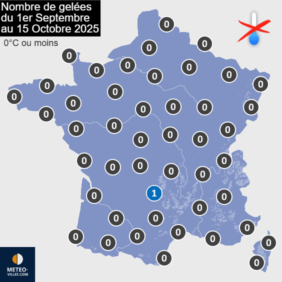 Nombre de gelées observées du 1er septembre au 15 octobre 2025 - Météo Villes