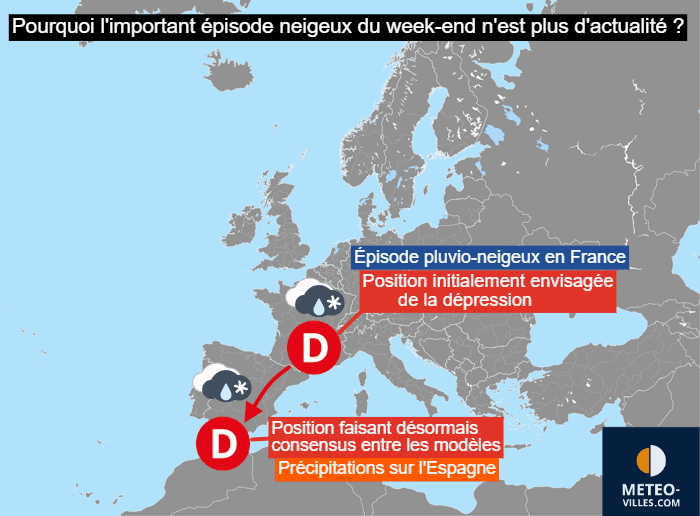 La cause de cette confusion ? Une dépression actuellement vers les Açores et qui devait se rapprocher de nos régions pour le premier week-end de l'année 2026. Jusqu'à hier, le scénario majoritaire voyait cette dépression atteindre le sud de la France, ce qui provoquerait un important conflit de masses d'air et un épisode pluvio-neigeux important sur le pays. Or, le scénario majoritaire voit désormais la dépression circuler vers Gibraltar, soit beaucoup plus loin. Par conséquent, le plus gros des précipitations resterait cantonné sur l'Espagne et un froid majoritairement sec dominerait en France.