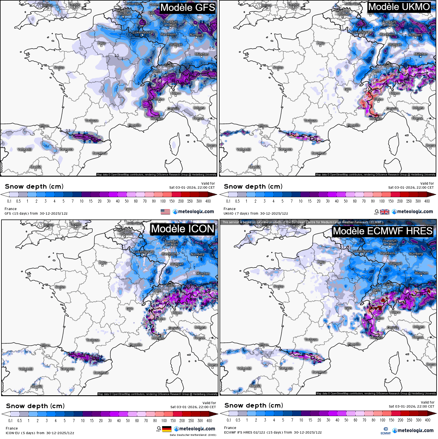 Différents scénarios de neige au sol pour le week-end des 3 et 4 janvier 2026, en date du 30 décembre 2025 - meteologix.com