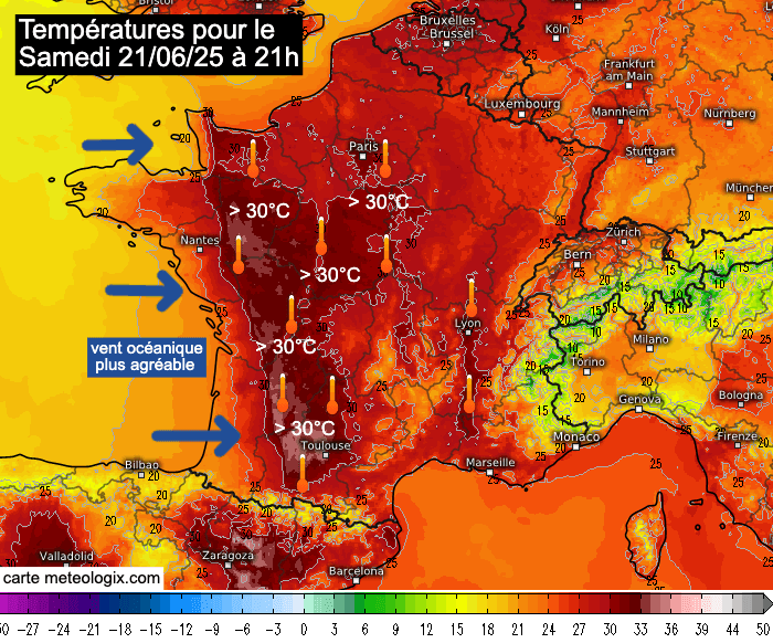 Comme la plupart des festivités liées à la Fête de la Musique se déroulent en soirée, la température du soir a un grand intérêt. Cette année, il ne sera pas nécessaire de se couvrir, bien au contraire ! Sur les coups de 21h, il fera encore plus de 30°C de la région toulousaine à la Basse-Normandie et au bassin parisien, tout comme en vallée du Rhône. En revanche, le vent d'ouest se lèvera sur les départements bordant la façade atlantique. Il atténuera nettement la chaleur et amènera des températures bien plus agréables sur ces zones.