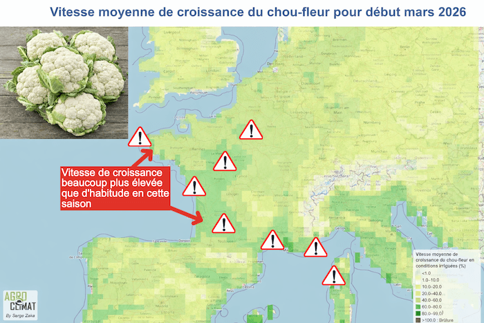 Vitesse moyenne de croissance du chou-fleur pour le début du mois de mars 2026 - carte Agro-climat diffusée par Dr. Serge Zaka @SergeZaka