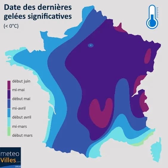 En effet, le développement précoce de la végétation grâce à la douceur de fin d'hiver/début de printemps l'expose d'autant plus aux épisodes de gel tardif entre la seconde partie du mois d'avril et le début du mois de mai. Le gel peut en effet se montrer encore assez fréquent au mois d'avril, excepté entre la côte Atlantique et les abords de la Méditerranée. Du sud-ouest au Nord, il peut généralement geler jusqu'à la fin du mois d'avril. Des valeurs négatives peuvent encore être observées en première quinzaine de mai du Massif Central au nord-est.