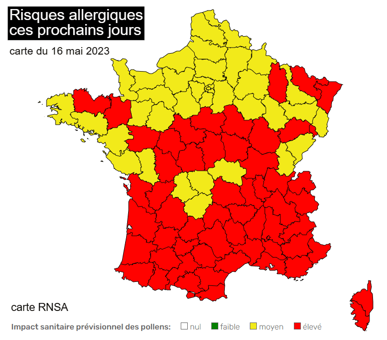Carte du risque allergique aux pollens en date du mardi 16 mai 2023 - via RNSA