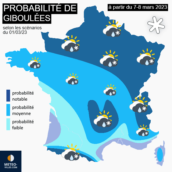 Dès lors, cette coulée d'air froid maritime associée à un contexte redevenant dépressionnaire sera favorable à la survenue de précipitations sous forme de giboulées. Pour l'heure, il subsiste encore des incertitudes notables sur l'extension du froid mais aussi sur l'instabilité réelle (précipitations plus ou moins fréquentes et plus ou moins étendues). Cependant, la plupart des scénarios en date du 1er mars 2023 modélisent des précipitations sous forme de giboulées (pluie, grésil, neige) entre le 7 et le 10 mars sur le nord, le centre et l'est de la France.