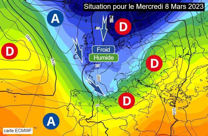 Situation envisagée pour le mercredi 8 mars 2023 - via ECMWF