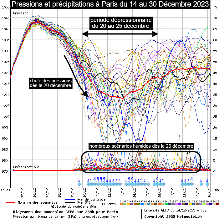 Lorsque l'on se penche sur les différents scénarios, on constate bel et bien cette chute des pressions dès le début de la dernière décade du mois de décembre. Toutefois, il existe encore des divergences entre des scénarios modérément perturbés et d'autres fortement agités (avec des pressions plus ou moins basses). On peut noter qu'une majorité de scénarios sont humides entre le 20 et le 25 décembre 2023. Les probabilités de connaître un Noël instable apparaissent plus grandes que celles de vivre un Noël calme. Soulignons cependant que le bassin méditerranéen est souvent à l'écart des pluies dans ce genre de situation.