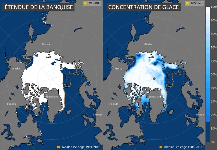 Étendue de la banquise et concentration de glace en Arctique au 11 novembre 2020 - via NSIDC