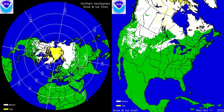Étendues de la neige (en blanc) et des glaces (en jaune) au 11 novembre 2020 - via NOAA