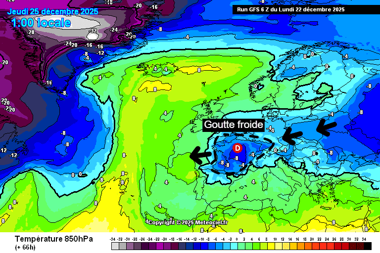 Le 24 décembre au soir, une dépression d'altitude va aborder la France par l'est, traversant notre pays d'est en ouest avant de s'évacuer par la façade Atlantique avant la fin de journée du 25 décembre. Cette goutte froide, s'accompagnant de températures situées entre -4 et -10°C à 850hPa apportera ainsi un temps temporairement plus hivernal sur la France avec même un risque de faibles chutes de neige sur certaines régions.