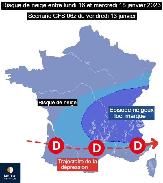 C'est en tout cas le scénario envisagé par certains modèles de prévision ce vendredi. Une dépression assez creuse pourrait en effet se former sur l'Atlantique entre lundi 16 et mercredi 18 et circuler d'Ouest en Est, induisant un risque d'épisode neigeux potentiellement marqué jusqu'en plaine au nord de celle-ci (air plus humide et afflux d'air froid plus marqué). Selon les scénarios de ce vendredi 13 janvier, cette dépression circulerait sur le Sud de la France, induisant donc un épisode neigeux jusqu'en plaine entre le Massif-Central, le Centre-Est et le Nord-Est du pays.