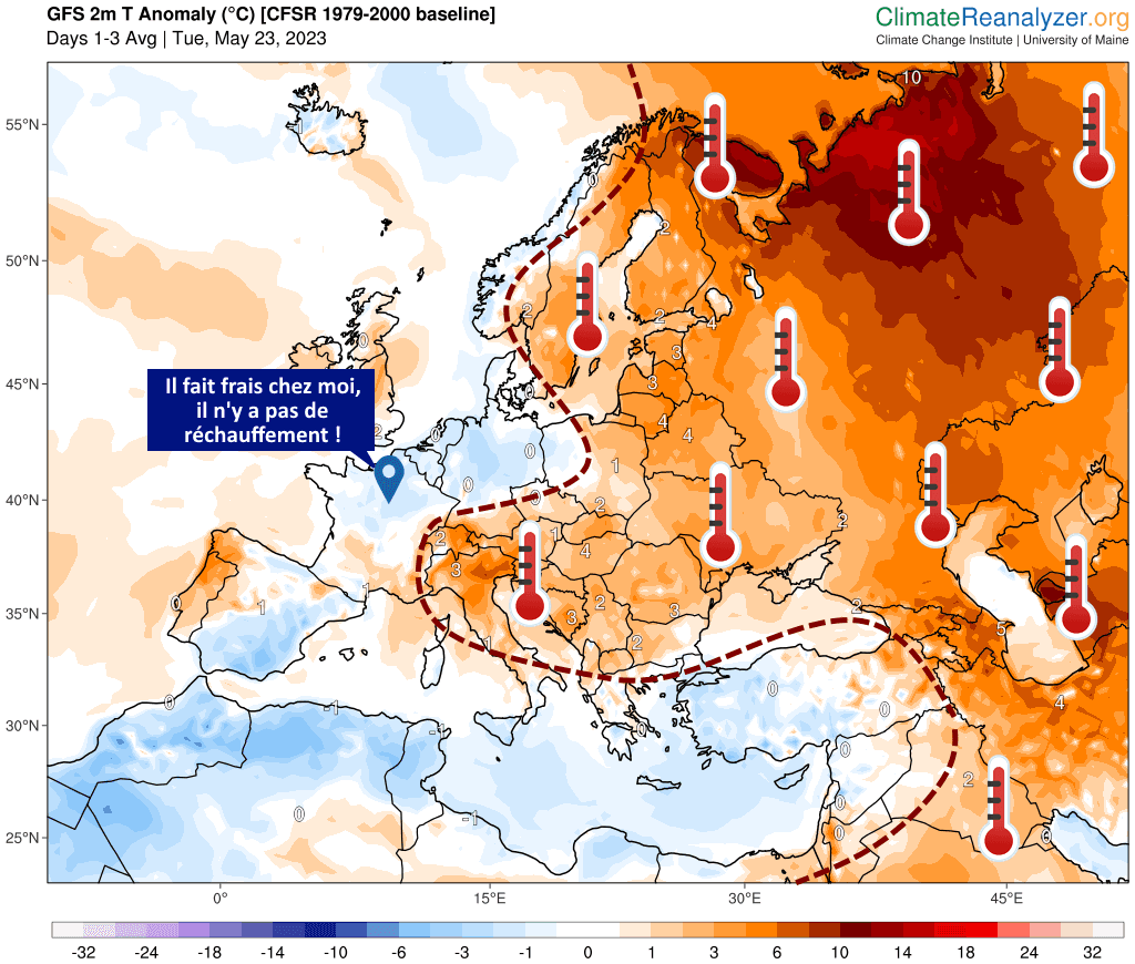 Malgré des éléments factuels mettant à mal leurs théories, les climato-sceptiques n'en démordent pas. Il faut dire que tous n'ont pas le même profil. Certains sont tout simplement auto-centrés et ne se focalisent que sur la météo de chez eux. Par exemple, une simple fraîcheur passagère comme celle que nous avons pu rencontrer lors de ce mois de mai 2023 suffira à nier le réchauffement, même si les anomalies chaudes ont l'avantage sur le reste du continent et du monde. De plus, si un printemps instable comme celui que nous vivons ne leur a pas offert suffisamment d'occasions de faire un barbecue, c'est un signe que le réchauffement n'existe pas ! Ces climato-sceptiques manquent sérieusement de recul et oublient que l'évolution du climat se lit sur de longues durées et de vastes régions.