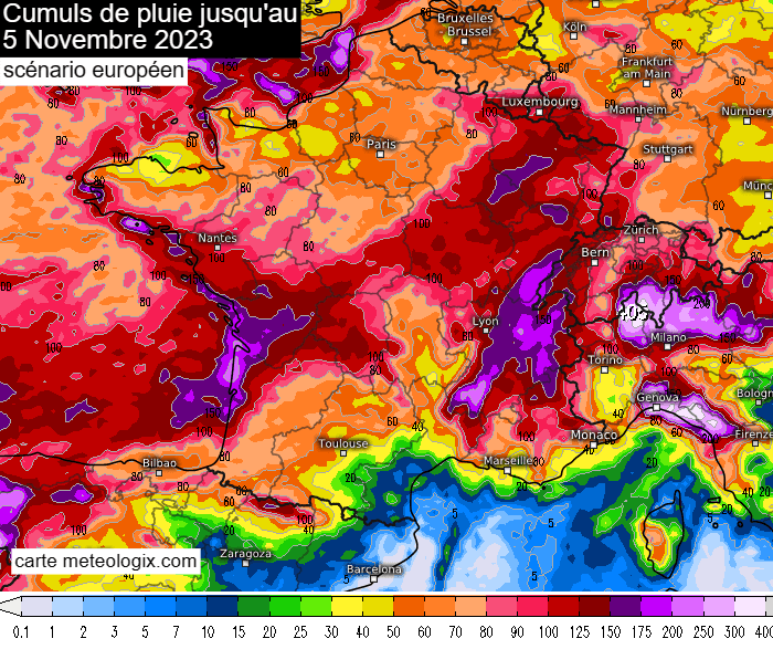 Cumuls de pluie prévus jusqu'au dimanche 5 novembre 2023 selon le modèle européen – via meteologix.com
