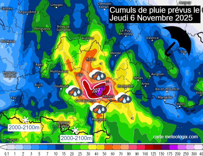 Le front pluvieux qui s'enfoncera sur le sud de la France ce jeudi 6 novembre 2025 va se bloquer sur l'Occitanie. Une grande partie de cette région recevra des quantités de pluie notables avec fréquemment entre 20 et 40 mm. Cependant, l'épisode sera bien plus important sur l'ouest des Cévennes et plus particulièrement entre l'est du Tarn, l'ouest de l'Hérault et le sud de l'Aveyron où il pourra tomber plus de 100 mm de précipitations. Les dernières modélisations s'attendent à des pointes de 200 mm sur l'ouest des Cévennes, notamment dans l'ouest des Cévennes héraultaises.