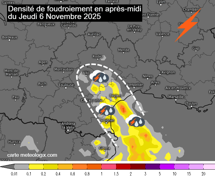 Densité de foudroiement modélisée en Occitanie ce jeudi 6 novembre 2025 - meteologix.com