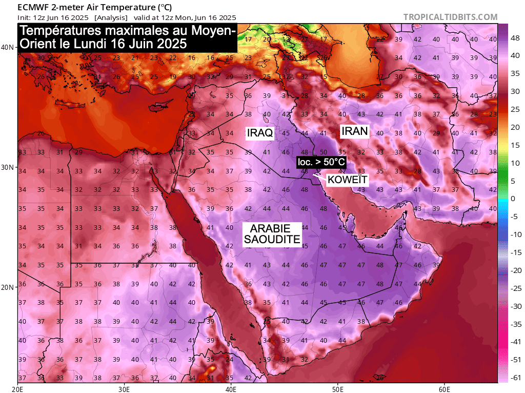 Températures maximales mesurées le lundi 16 juin 2025 au Moyen-Orient - tropicaltidbits.com
