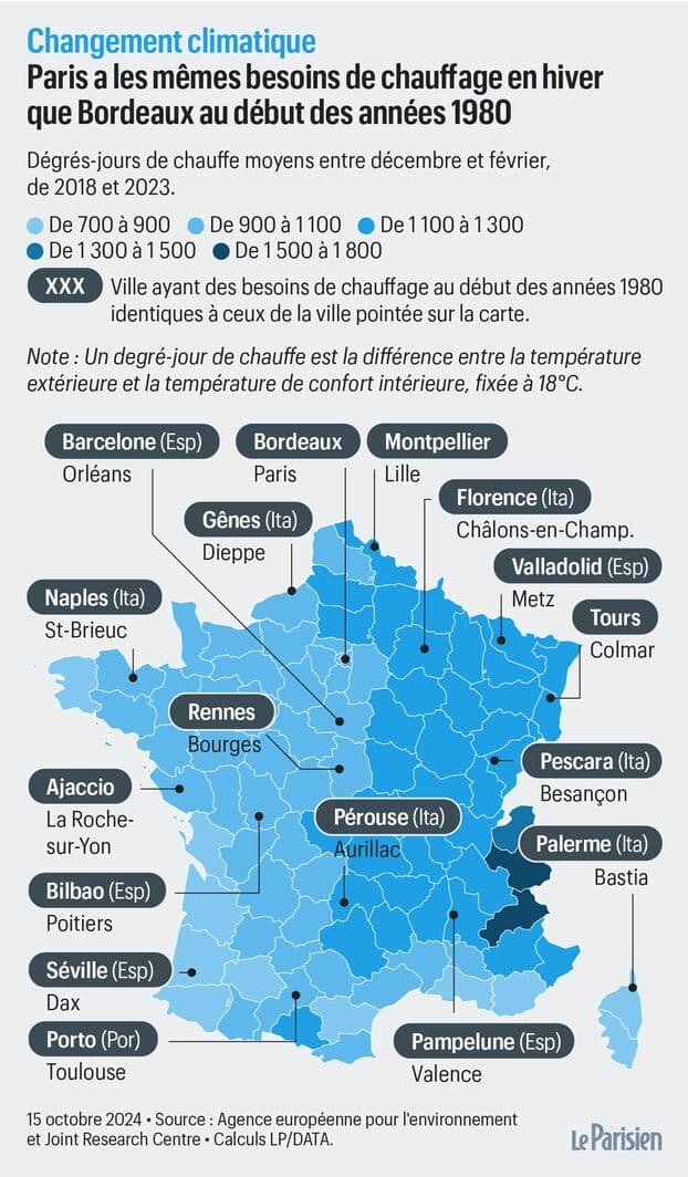Degrés jours durant la saison froide en France ainsi que l'évolution des besoins de chauffage comparée à d'autres villes entre le début des années 80 et maintenant - infographie Le Parisien