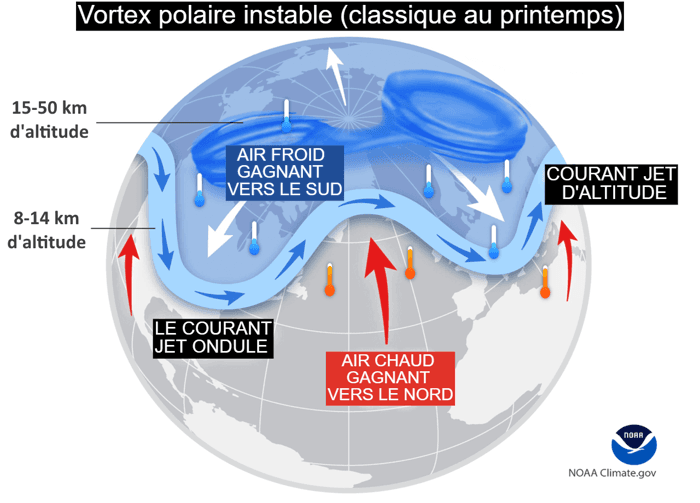 Schéma d'un vortex polaire instable et d'un courant jet ondulant (classique au printemps) - NOAA