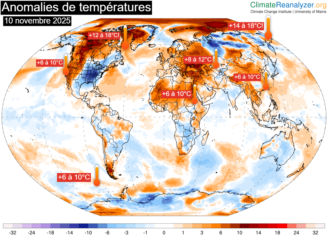 Anomalies de températures dans le monde en ce 10 novembre 2025 - ClimateReanalyzer