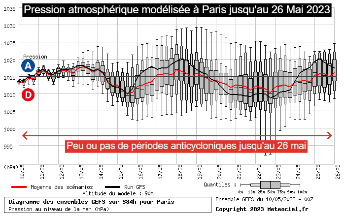 Moyenne des modélisations de pression à Paris du 10 au 26 mai 2023 - via meteociel.fr