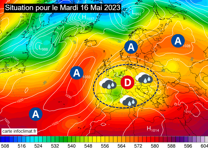 Situation à échelle continentale pour le mardi 16 mai 2023 - carte infoclimat.fr