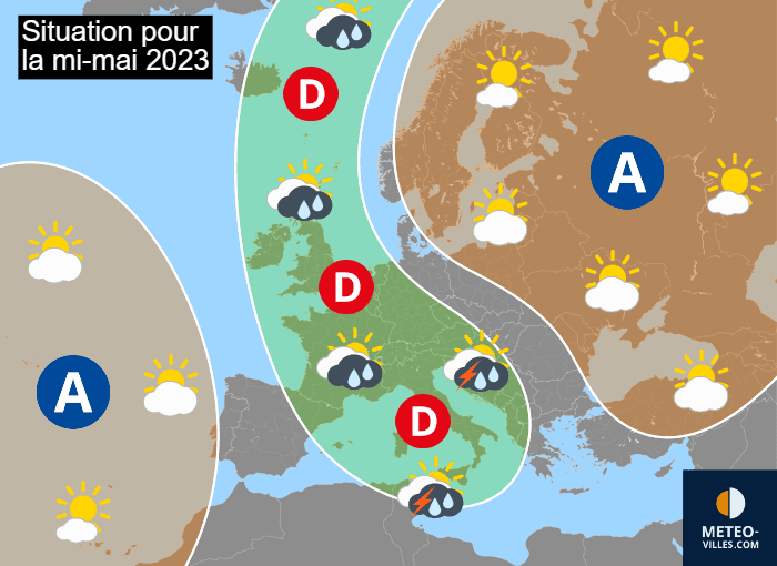 En ce début mai 2023, la donne a encore évolué à échelle continentale avec le retour de l'anticyclone vers les Açores. Dans le même temps, le blocage anticyclonique est toujours en cours sur la Scandinavie. Cependant, ces deux cellules anticycloniques ne se rejoignent pas, ce qui laisse une brèche entre les deux. Cela permet à des anomalies dépressionnaires de glisser de la Mer de Norvège en direction de la France et jusqu'au bassin méditerranéen. Ces basses pressions se retrouvent prises en étau entre les deux zones de hautes pressions, si bien qu'elles ne devraient que très peu bouger et stagner dans les parages de notre pays pour les 10 prochains jours.