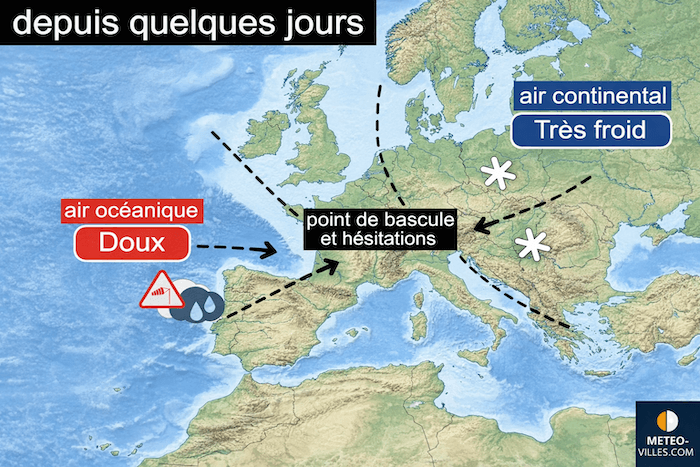 La France se trouve dans une zone de conflit entre le puissant courant océanique, doux et humide, et l’air froid qui persiste sur l’Europe continentale. Il suffit que le courant perturbé océanique circule plus au sud pour que l’air froid continental bascule à nouveau vers notre pays.