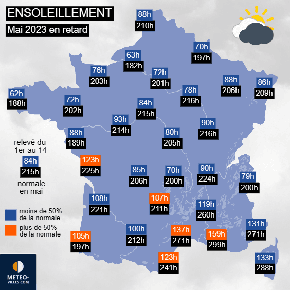 Ensoleillement du 1er au 14 mai 2023 et normale mensuelle du mois de mai - Météo Villes