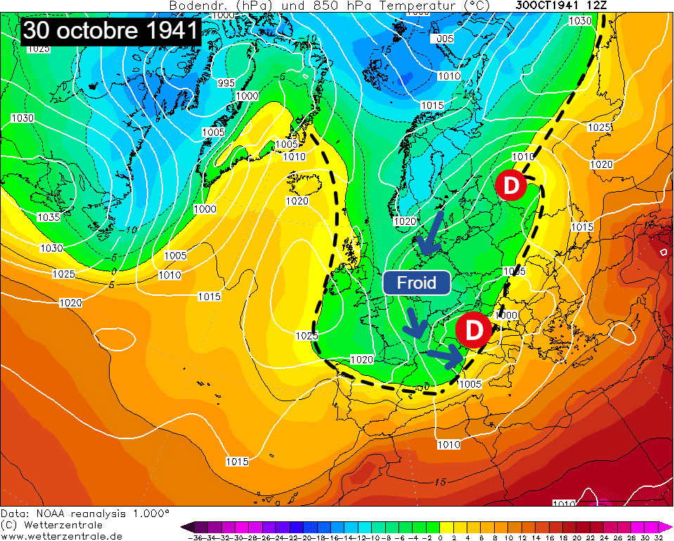 Après une chaleur remarquable au début octobre, un froid exceptionnellement précoce concerne toutes les régions entre le 30 octobre et le 5 novembre 1941 en liaison à une descente d'air polaire venu du nord-est du continent européen.