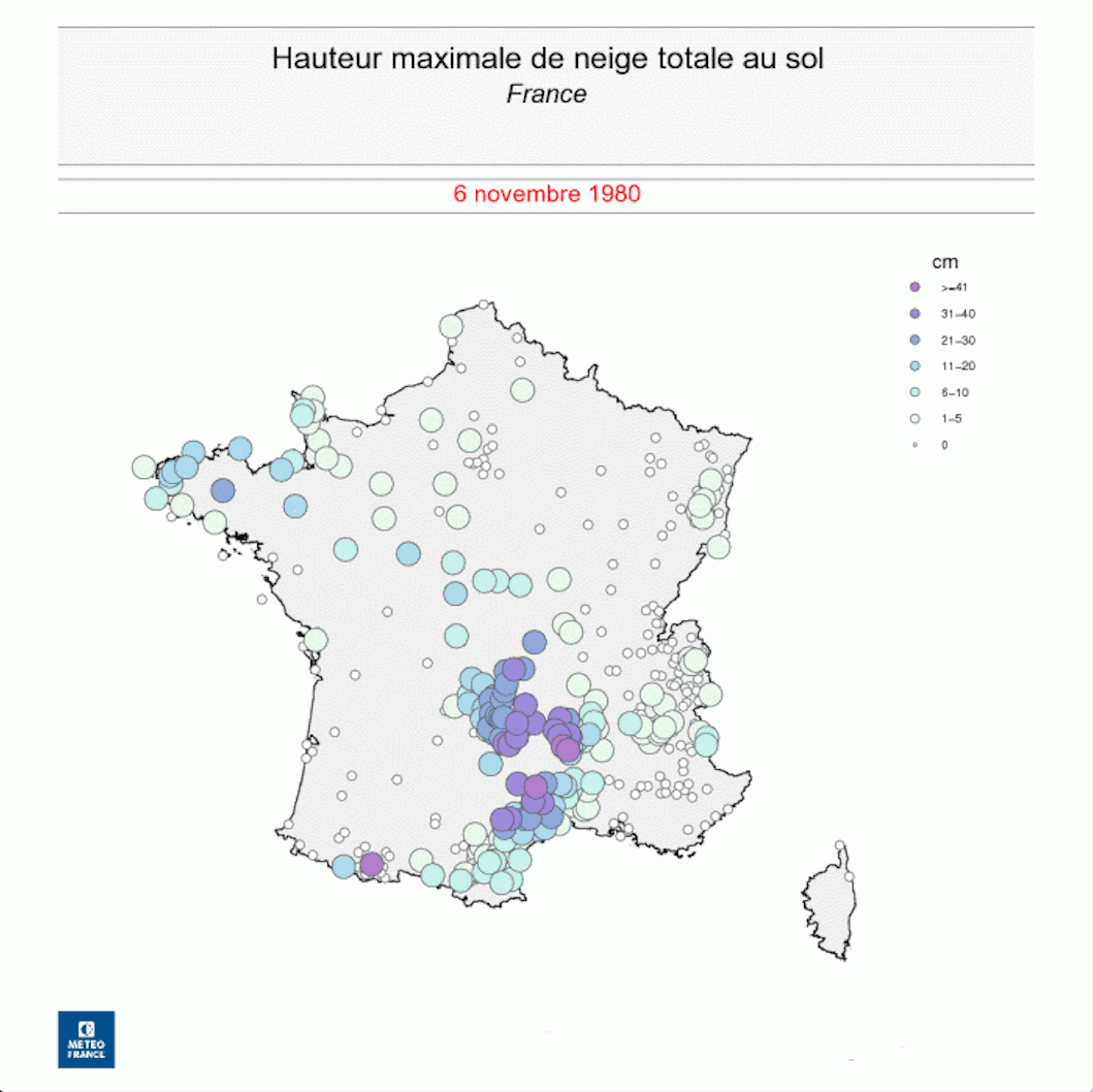 Le 5 novembre 1980, la neige se généralise à tout l’ouest et au sud-ouest du pays - on mesure 50cm de neige à Aubenas et Privas (Ardèche), 40cm à Millau, 26cm à Vichy, 20cm à Issoire, 15cm à Nantes, 10cm à Tours, 7cm à Lanvéoc (Bretagne), 4cm à Rennes - il neige également à Paris, et surtout à Brest, Montpellier et Perpignan où l’on mesure entre 10 et 20cm - au cours de cette journée, la température ne dépasse pas -1°C à L’île d’Yeu, Nantes, Angers et bien d’autres villes de l’ouest de la France. Le 6 novembre 1980, la neige concerne toutes les régions situées entre la Seine et la Belgique.