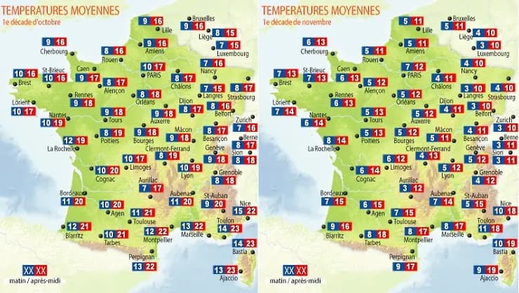 Températures moyennes en 1ère décade d'octobre et 1ère décade de novembre - lameteo.org