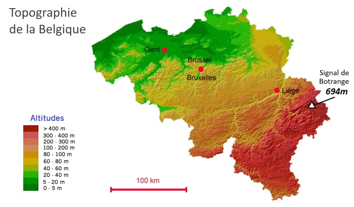 Avant de s'intéresser au climat de la Belgique, il est important d'évoquer sa topographie. La Flandre (nord du pays) est une région très plate où l'altitude dépasse rarement les 50 mètres. En revanche, la Wallonie (sud du pays) est plus vallonnée. Dans le sud-est du pays, les communes du plateau ardennais se situent souvent entre 300 et 500 mètres d'altitude. C'est dans les Hautes Fagnes (au nord du Luxembourg) que les altitudes les plus élevées sont observées, dépassant localement les 600 mètres.