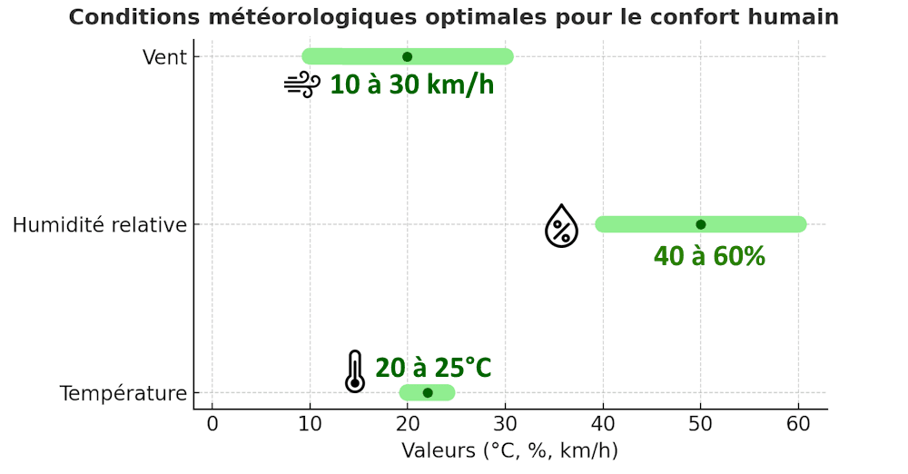 Comme nous venons de l'évoquer, il existe des conditions météorologiques qui permettent un état d'équilibre thermique de l'organisme, réduisant donc au maximum ses efforts, ce qui fournit cette sensation de confort. Chez la plupart des individus, la température idéale pour l'organisme se situe entre 20 et 25°C. À ces valeurs, il n'y a ni frissons, ni sudation excessive. De plus, le taux d'humidité de l'air est aussi important. Le taux idéal est compris entre 40 et 60%. Ces niveaux favorisent l'évaporation de la sueur tout en évitant le dessèchement des muqueuses. Enfin, une légère brise (de 10 à 30 km/h) améliore encore ce processus en facilitant les échanges de chaleur avec l'air ambiant, sans provoquer de refroidissement trop important.