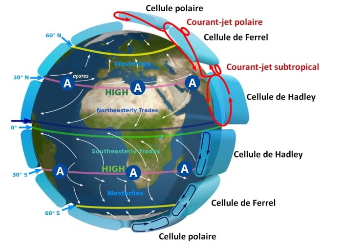 Rappelons que la circulation atmosphérique se divise en trois cellules dans chacun des deux hémisphère : la cellule polaire au niveau des pôles, la cellule de Ferrel aux latitudes moyennes (entre 30 et 60°) et la cellule de Hadley aux latitudes plus basses (entre 30° et l'équateur). Le courant jet circule de part et d'autre de la cellule de Ferrel et apporte une circulation atmosphérique d'ouest en est à nos latitudes moyennes, d'où une influence océanique notable en France. C'est au nord de la cellule de Hadley que l'air est peu instable et que les conditions sont réunies pour qu'une cellule anticyclonique y soit présente durant une bonne partie de l'année. C'est ce qu'on appelle le fameux anticyclone des Açores.