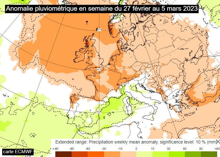 Anomalie pluviométrique en semaine du lundi 27 février au dimanche 5 mars 2023 - via ECMWF
