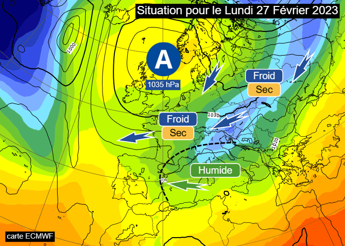 Après le retour des nuages et de quelques pluies au milieu de cette semaine (notamment les mercredi 22 et jeudi 23 février 2023), l'anticyclone se consolidera de nouveau sur les Îles Britanniques durant le week-end des 25 et 26 février. Il s'affirmera en début de semaine prochaine et jusqu'au début du mois de mars 2023 entre les Îles Britanniques et la Mer du Nord avec des pressions comprises entre 1035 et 1040 hPa en son centre ! Ce dernier dirigera un flux continental de secteur nord-est sur la France à partir de ce dernier week-end de février, renforcé par des anomalies dépressionnaires en Méditerranée.