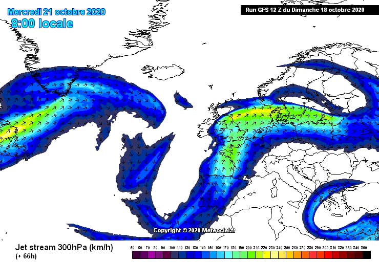 Circulation du jet stream mercredi 21 octobre 2020 - modèle GFS via meteociel.fr